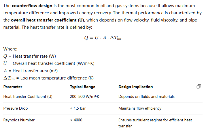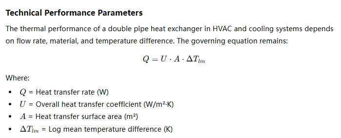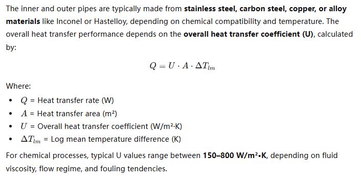 The inner and outer pipes are typically made from stainless steel, carbon steel, copper, or alloy materials like Inconel or Hastelloy, depending on chemical compatibility and temperature. The overall heat transfer performance depends on the overall heat transfer coefficient (U), calculated by:
