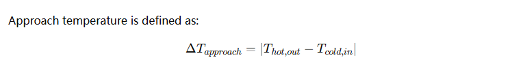 The approach temperature is the minimum temperature difference between the outlet of one stream and the inlet of the other. It represents the thermal pinch point — the lowest allowable temperature difference across which heat is transferred.