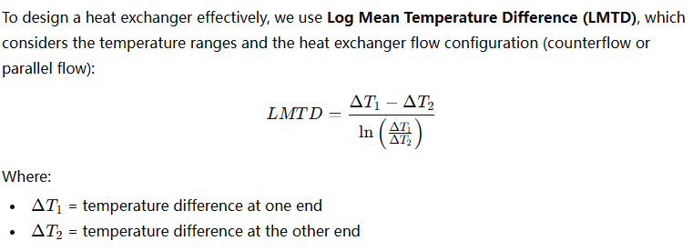 To design a heat exchanger effectively, we use Log Mean Temperature Difference (LMTD), which considers the temperature ranges and the heat exchanger flow configuration (counterflow or parallel flow):