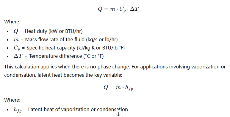 Depending on the type of process—cooling, heating, evaporation, or condensation—the way heat duty is calculated will vary. Every fluid, temperature range, and flow rate combination leads to a unique heat duty requirement. It’s essential to define this early in the engineering phase, as everything from surface area to material thickness depends on it.
