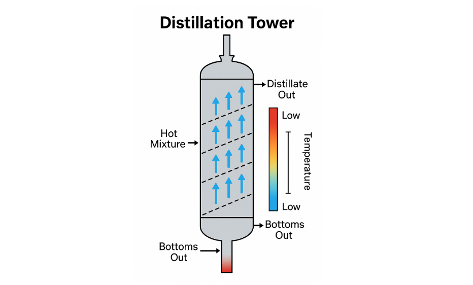 Distillation is the most widely used separation method in chemical process industries. It relies on differences in component boiling points to separate liquid mixtures into individual compounds or groups. In a distillation column, a feed mixture enters the middle portion of the tower. Heat applied at the bottom generates vapor that rises through a series of trays or packing materials. As vapor travels upward, it contacts descending liquid, resulting in mass and heat transfer. The lighter components (lower boiling points) continue upward and exit as overhead vapor, while heavier components (higher boiling points) condense and exit from the bottom.